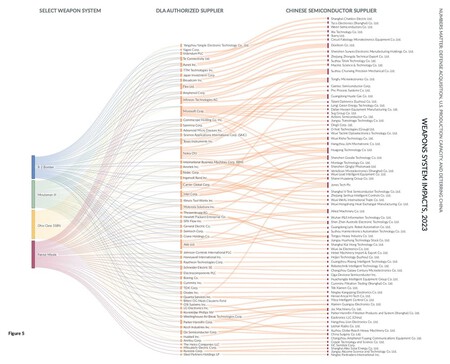Gráfico que vincula las armas estadounidenses con sus fabricantes chinos. Los números importan: adquisición de equipos de defensa, capacidad de producción en EE. UU. y disuasión de China