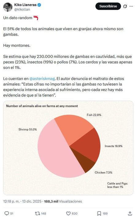 Expresado en números, esto significa: En comparación con los 230 mil millones de camarones y langostinos promedio que viven en las piscifactorías, hay “sólo” 779 millones de cerdos y 1,55 mil millones de bovinos, 33 mil millones de pollos y 125 mil millones de peces de piscifactoría. Si los datos en sí no eran claros, enfatiza el activista que 440.000 millones de estos decápodos son sacrificados para su consumo cada año, “más de cuatro veces el número de personas que han vivido en la Tierra”.