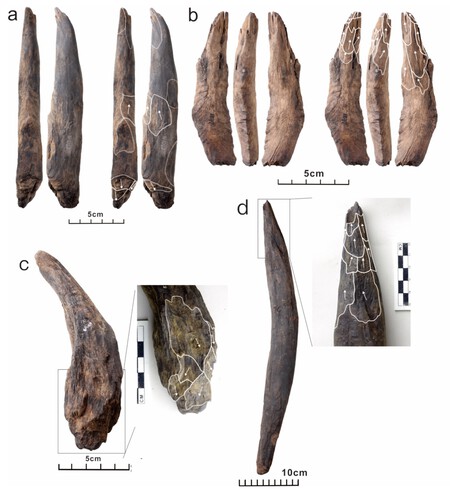 Esta colección incluye Herramientas de todo tipoAl igual que los grandes palillos para cavar dos manos, ganchos y algunos suministros e investigadores más pequeños, describa que tienen trazas de producción claras, como extremos redondeados, piezas afiladas y otras superficies pulidas.