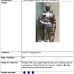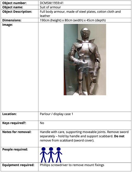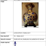No obstante, además, se deberán dar una serie de instrucciones para que el personal ajeno al museo (por ejemplo los bomberos antes mencionados) esté al tanto de su comportamiento. En esta tabla, la guía incluye el número de referencia del objeto, una fotografía del mismo para que tengas claro qué es, si se necesitan llaves para acceder a la vitrina y dónde están ubicadas, así como recomendaciones de manejo (guantes, caja, etc.) y cuántas personas se necesitan para mover el objeto. No te abrumes con detalles: cuanto más concisos, mejor.