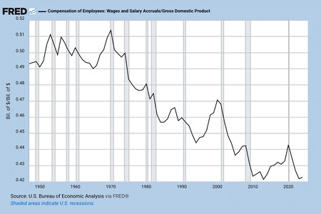 Desde la década de 1990, factores como la globalización, la pérdida del poder de negociación sindical y la concentración de capital en grandes empresas han erosionado la participación del trabajo en los ingresos. Tiffany Wilding, economista de PIMCO, dijo: «Desde las computadoras y el software hasta la automatización y la inteligencia artificial, las herramientas tecnológicas están reemplazando fácilmente a los trabajadores medios y cada vez más calificados».