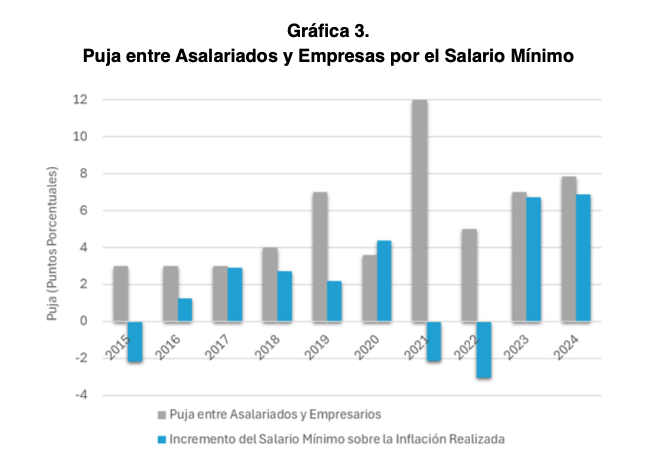 - Reconocer únicamente la inflación al ajustar el salario mínimo reduce la proporción de los salarios en el PIB. Un aumento que reconozca la inflación y la productividad (tal como se calcula en el modelo neoclásico) sólo contribuye a mantener constante dicha participación.