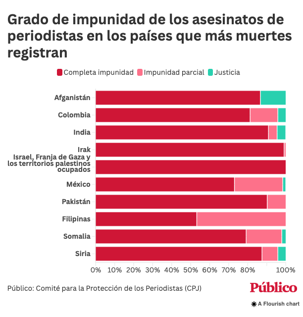 El año en que el CPJ podría confirmar que más asesinatos estaban completamente impunes a partir de 2005. Año, con un total de 40 periodistas. Ninguno de ellos tenía justicia. Ese año, la muerte en la Guerra iraquí fue quien balanceó el total muerto. Todos los asesinatos de periodistas en 2008, 2012, 2016, 2019, 2020. Y 2021. Fueron impunes. Por lo tanto, Jonathan Dagher señala, es importante recordar que «esto no comenzó el 7 de octubre, pero antes». «El La impunidad, explica, funciona como un virus que está «infectado» como se practica más practicado.
