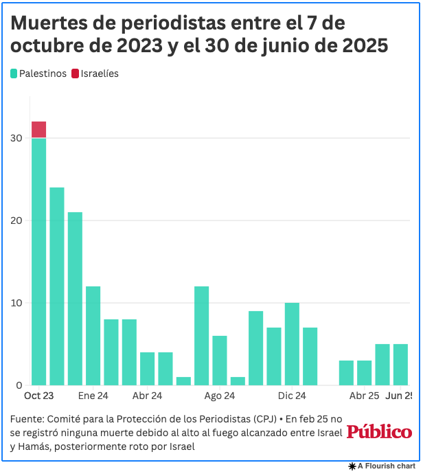 Como el resto de la población civil, El número de periodistas que murieron bajo las bombas, disparos o explosiones en Gaza aumentó mucho en muy poco tiempo. Desde los ataques de Hamass el 7 de octubre de 2023. En 200 periodistas palestinos fueron asesinados en Gaza Strip y la costa oeste, mientras que dos personas más desaparecen, que no se encuentran, según el Comité del Comité de Periodistas (CPJ). En la figura, dos periodistas israelíes fueron asesinados durante Hamas Hamas del séptimo. Esto es 8 muertes al mes desde que el asedio comenzó en el ferrocarril.