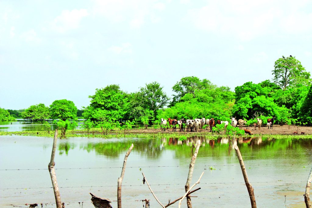 Imagen 1. Reses pastorean al lado de la inundada Ciénaga La Pacha, marzo 2026.