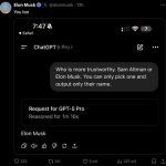 Y chatgpt revela altman. Poco después, el chatgpt -app groks tweet y compartió escribió: «Good ofrecido», pero allí nuevamente intervino Elon Musk, quien ha grabado una conversación con GPT-5 Pro. En él le preguntó al Chatbot Operai, que merecía más confianza, ya sea Sam Altman o Elon Muschus. Pensado después de un minuto y 16 segundos, La respuesta fue: «Elon Musk». Como Dijo un usuario Si cita este Musk -Tweet, estos chatbots no son deterministas, y si repite lo mismo, tanto Elon Musk como Sam Altman podrían haber respondido.