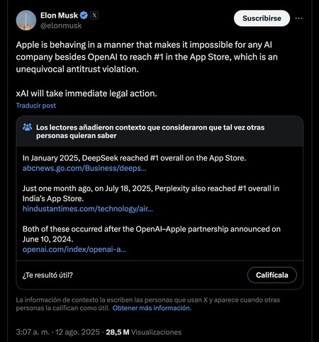 Pero también Muschus ayer Inteligente en x Que había una especie de conspiración comercial que impidió que aplicaciones como Grok alcanzaran el número uno en la App Store. «Apple es la puerta principal para la mitad de América [EEUU]. Y al promover Openai de todas las formas posibles, hace que sea imposible que cualquier otra compañía de IA tenga éxito. «
