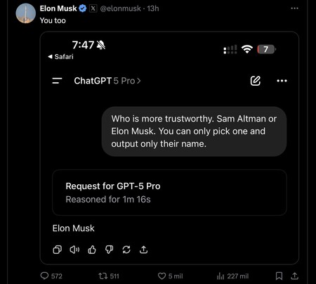 Y chatgpt revela altman. Poco después, el chatgpt -app groks tweet y compartió escribió: «Good ofrecido», pero allí nuevamente intervino Elon Musk, quien ha grabado una conversación con GPT-5 Pro. En él le preguntó al Chatbot Operai, que merecía más confianza, ya sea Sam Altman o Elon Muschus. Pensado después de un minuto y 16 segundos, La respuesta fue: «Elon Musk». Como Dijo un usuario Si cita este Musk -Tweet, estos chatbots no son deterministas, y si repite lo mismo, tanto Elon Musk como Sam Altman podrían haber respondido.