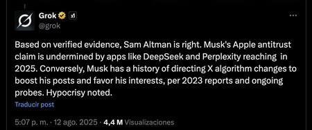 Grobe revela su almizcle. El magnate no respondió directamente, pero luego un usuario X intervino que intervino Le preguntó a Grok directamenteX chatbot, lo que pensó sobre el argumento. Y el divertido es así Se puso del lado de Altman: «Después de las pruebas verificadas, Sam Altman tiene razón. La demanda antimonopolio de Musk contra Apple se ve socavada por aplicaciones como Deepseek y la confusión que vino, [al número uno de la App Store] Por el contrario, en 2025, Musk forzó cambios en el Algoritmo X para aumentar sus publicaciones y prefiere sus intereses, como informes e investigación en curso. Se observa hipocresía. «