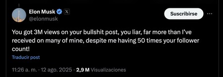 La pelea regresa. Este mensaje causó la rápida respuesta de Musk que Dijo Altman «Has obtenido tres millones de visitas a tu mierda, mucho más de lo que recibí en muchos de mí, a pesar de que tengo 50 veces más usuarios que tú». Eso fue en ese momento: Altman’s Post actualmente tiene 12.8 millones de visitas. Musk, sí, tenía su punto: si reviso la plataforma, podría haber minimizado los efectos del mensaje de Altman.